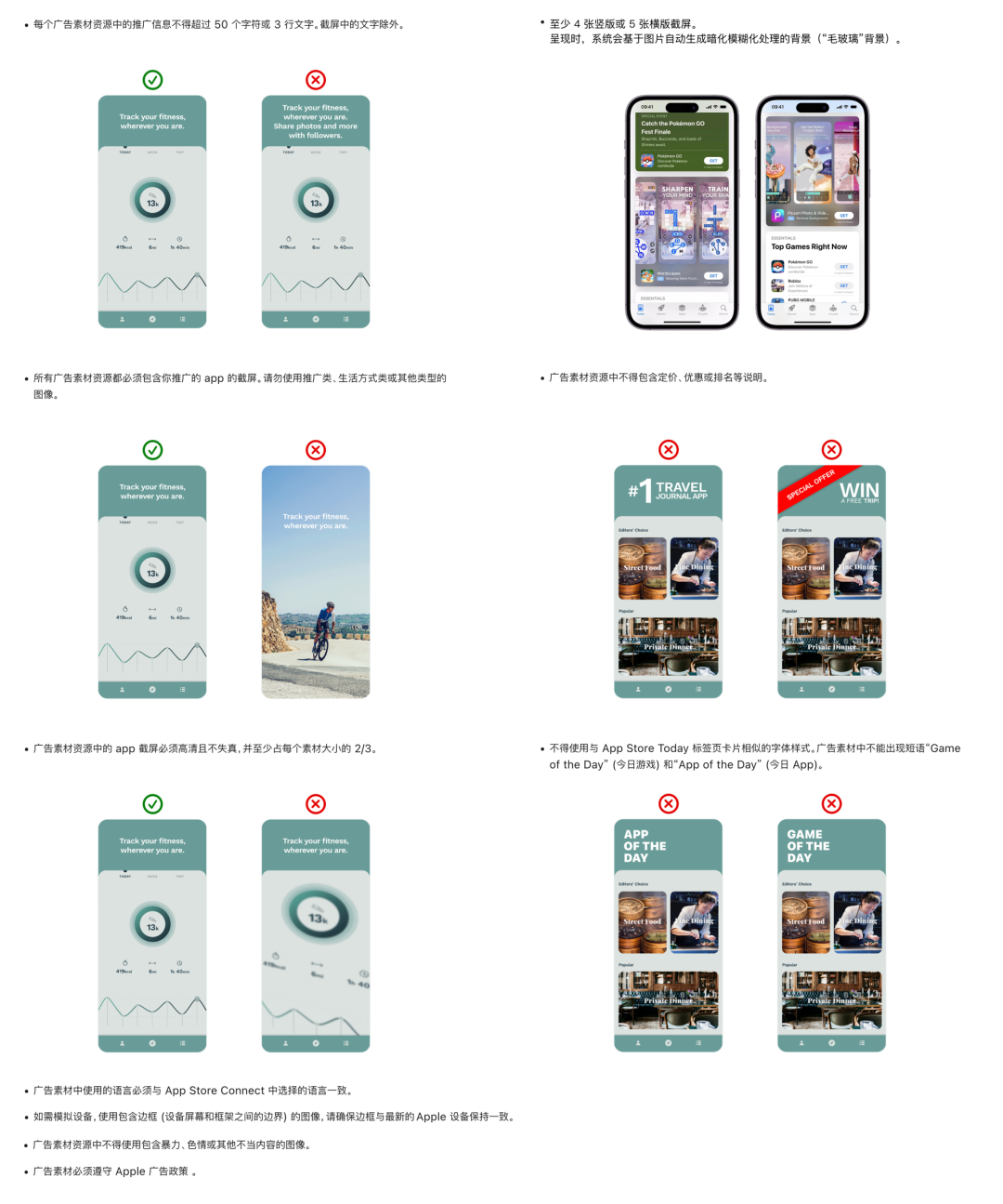 自定产品页面需要获得 App Store Connect 的批准,而广告则需要获得 Apple Ads 的再次批准。Apple Ads 将根据以下准则审核 Today 标签页广告素材:
