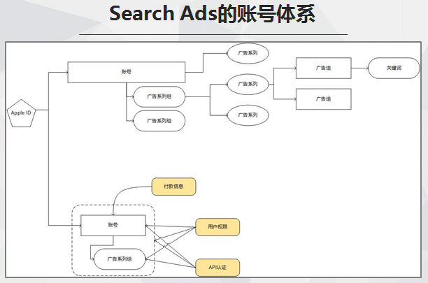 此外,Search Ads账号体系需要特别说明,以前见过很多把账号体系做成层级结构的,其实不然,或者说不严谨。于是我们重新画了张账号体系图。