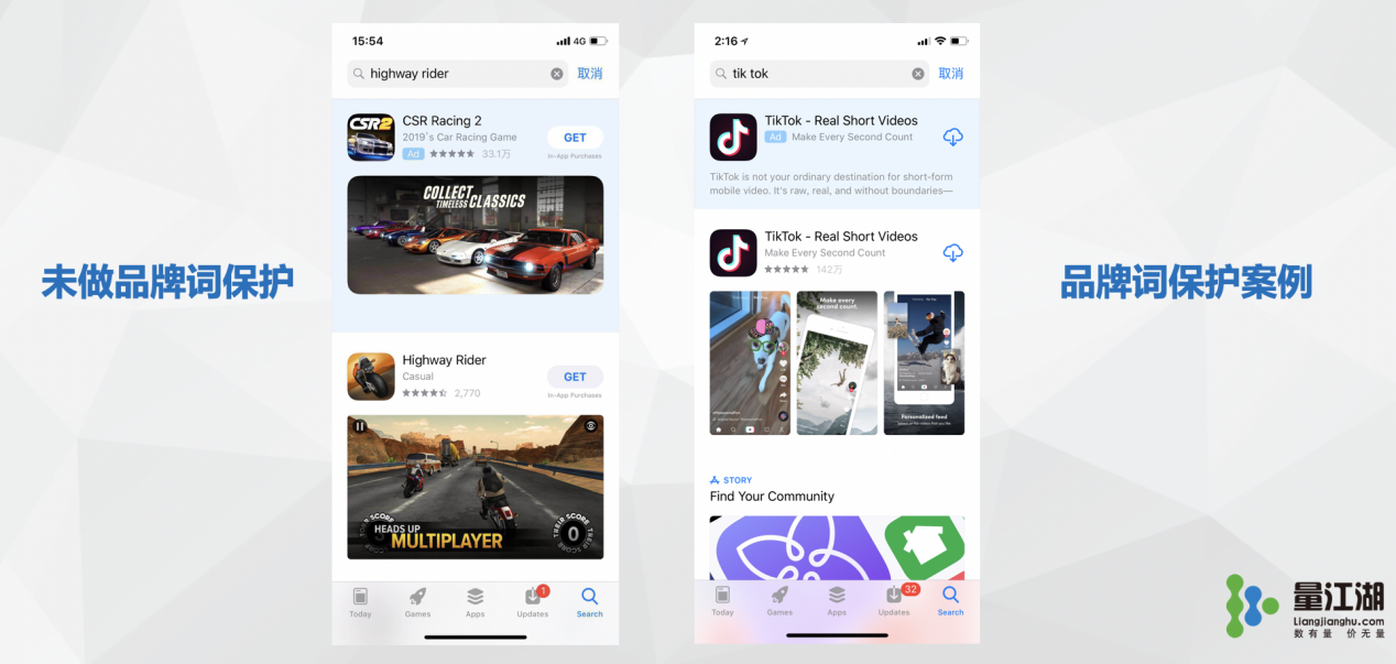 量江湖发现,现在App Store中有部分STORY已经排至第一的位置,产品则排在其后。如果不进行品牌保护,在搜索该产品品牌词时,首页基本没有该产品的展示机会,大大增加了竞品抢量的风险。进行品牌保护后,则可以更有效的防止竞品增量。